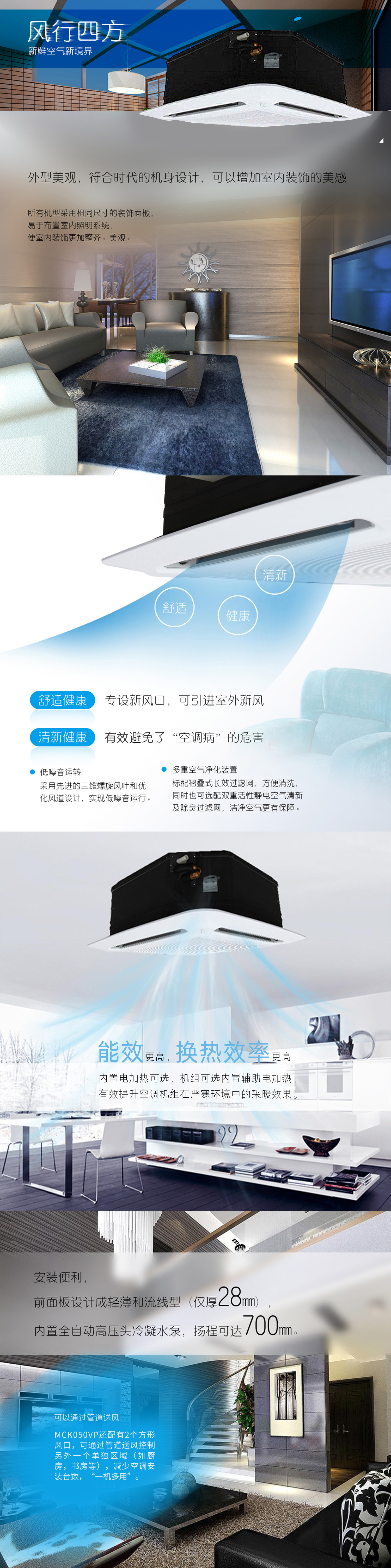 產(chǎn)品理念:新一代環(huán)保系列天花嵌入式空調(diào)機(jī)組,采用先進(jìn)的空調(diào)換氣設(shè)計(jì),并通過多重降噪處理,集環(huán)保、節(jié)能、靜音、清新、舒適于一身,營造一個(gè)自然健康的生活環(huán)境,可時(shí)刻享受清新健康的空氣,擺脫“空調(diào)病”的危害。